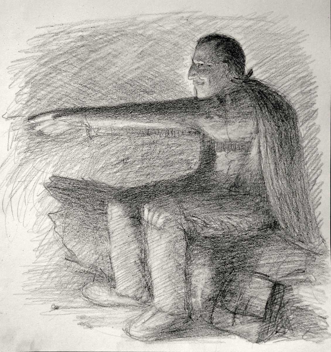 In the first sketch we get a solid, rough idea of George at the fire, but I wanted his pose to be more dynamic and also more "open" to Wynonah, who will be seated opposite him. In the more complete sketch he doesn't have the appearance of someone who will meet her halfway. In the second sketch he is more relaxed and reaches farther out to her.